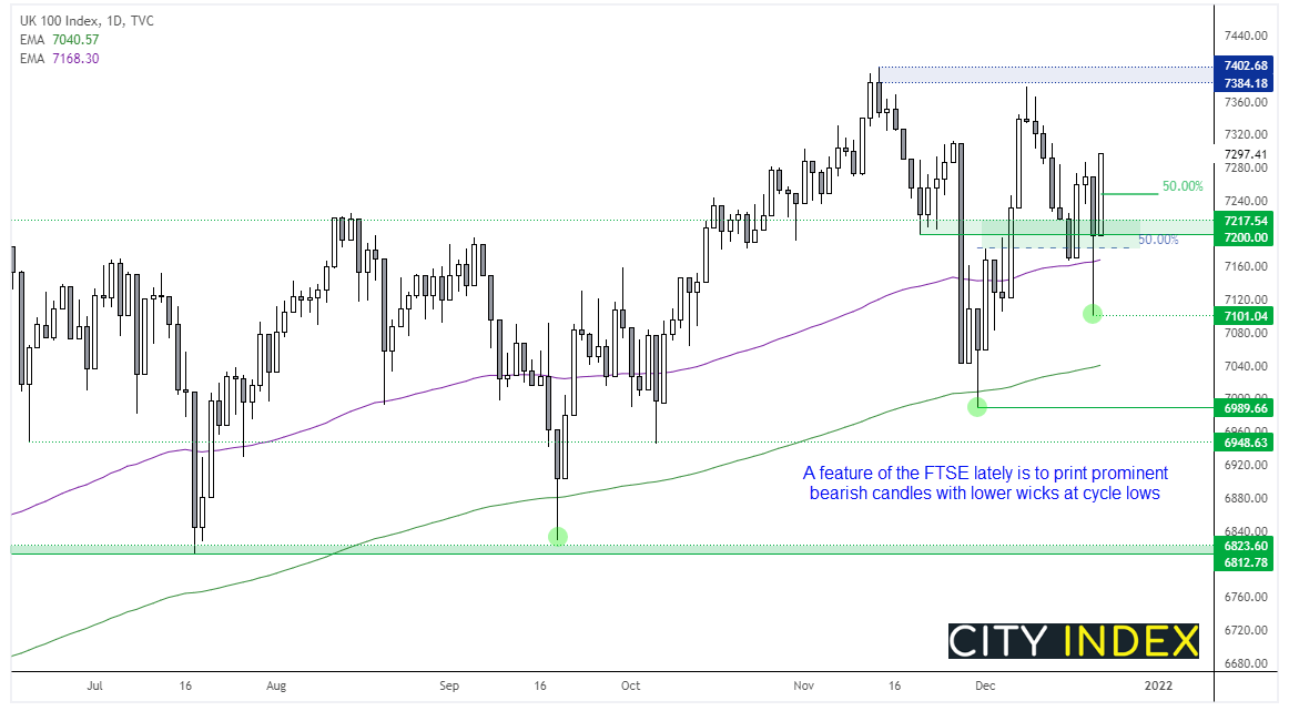 跟昨天大部分股指类似,富时100指数的反弹持续到收盘。实际上,看涨吞没K线开于当天低点并收于当天高点,构筑一条完整的看涨Marabuzo线。7250附近该K线之50%回档可提供支撑,若回撤守住该水平之上,或引发做多兴趣。若升穿7300,焦点看向11月和12月高点。