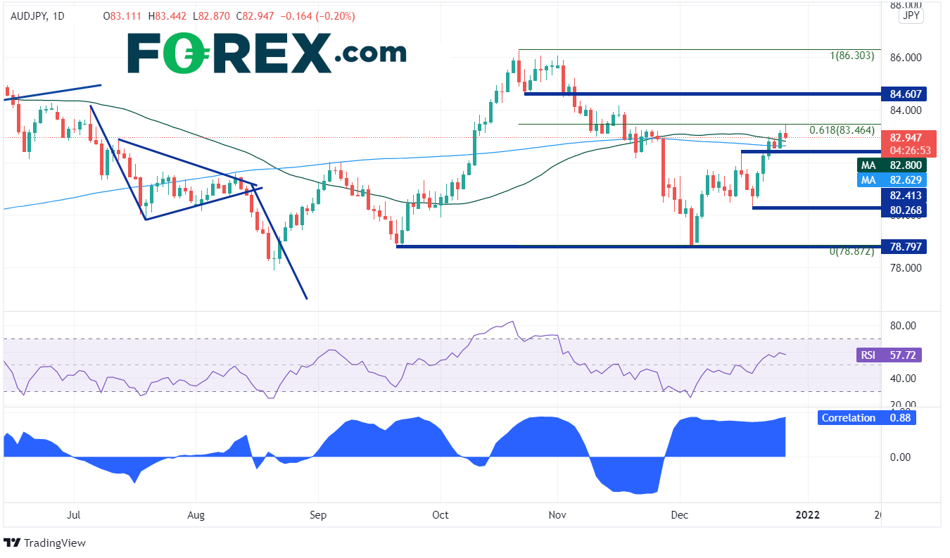澳元/日元是另一个和标普500指数挂钩的典型日元货币对。该货币对从12月21日的80.75反弹至10月21日高点到12月3日低点的61.8%回档位83.46后止步,期间站上50天和200天均线,分别落在82.80和82.63,使其现在转化为支撑位。请注意下图底部澳元/日元和Emini标普期货的相关系数,目前报在+0.88。这也是个表明强正相关的读数。阻力位在前述61.8%回档位83.46,接着是水平阻力位84.60。下方支撑位有均线之下的水平支撑位82.80,接着是80.36。