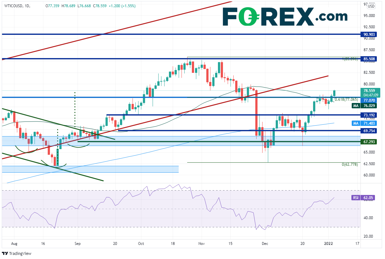 受到OPEC+做出符合预期的产出配额决策、原油库存减少、道指上涨的推动,西得州原油价格在2022年前3个交易日走高。但回调时机或已成熟,如果确实回撤,与之高度相关的澳元/美元可能随之回调。