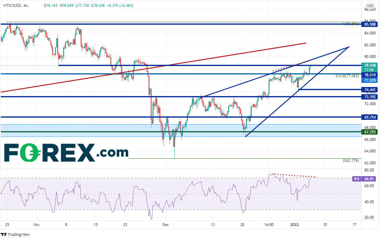 西得州原油4小时图抢先探入78.60附近的水平阻力位,目前逼近上升楔形的相汇点。根据市场预期,上升楔形的突破方向是向下。该形态上斜的上轨趋势线在79.40附近且构成阻力位,再往上的阻力为长期通道的下轨趋势线所在的0.8230附近。但请注意,RSI目前与价格背离,表明价格或许准备回调。下档第一支撑位在前水平阻力位77.06附近、上升楔形的下轨趋势线76.00附近,以及2021年低点74.44。