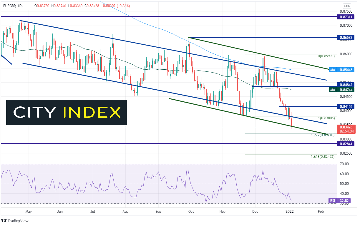 如果真如鲍里斯·约翰逊所预测的那样,奥密克戎变种能够得到遏制,且英国也不会进一步实施限制或封锁措施,英镑应看涨。因此,欧元/英镑可能继续下挫。不过,由于欧盟CPI将于周五发布,加之RSI与汇价走势背离,要留意货币对短线或有反弹。