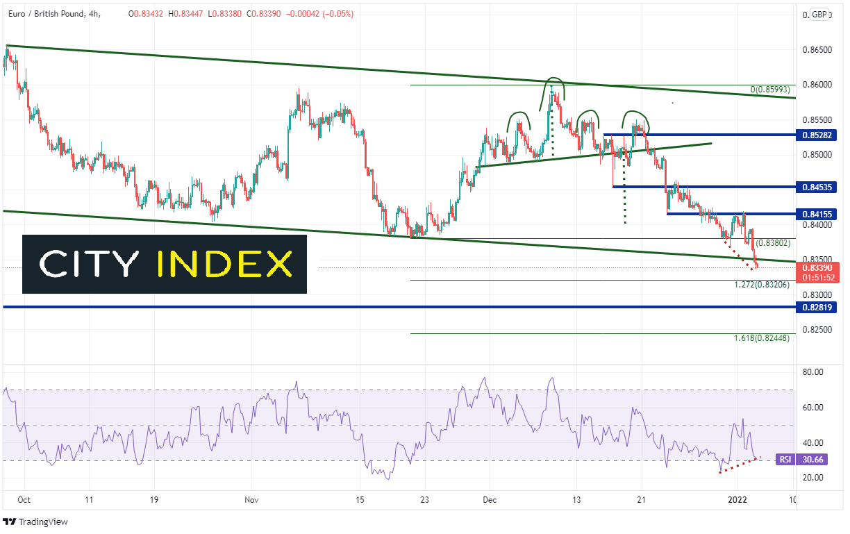240分钟时间轴上,汇价在较宽(绿线)通道内完成头肩形态 (两个右肩),并触及0.8400前低点附近目标。价格继续走低,今天下破0.8350附近通道底部趋势线。下方支撑位落在2021年11月21日低点至2021年12月8日高点上行之127.2%斐波那契扩展0.8321附近,然后是2020年2月18日低点0.8282附近。若失守,汇价或探向前述时期走势之161.8%扩展0.8245附近。但请注意RSI正在与价格背离,表明货币对可能做好反弹准备。上方阻力位在0.8380附近前低点。若攻克,接下来的水平阻力落在0.8415和0.8454。