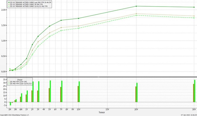 美国2年期债券收益率整体高于一个月前的水平,而中期收益率更是远高于一年前的水平