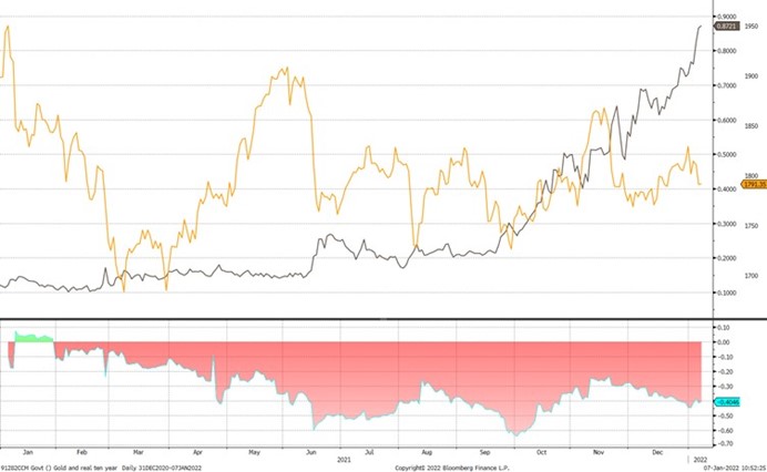 黄金和美国2年期债券收益率之间的相关性