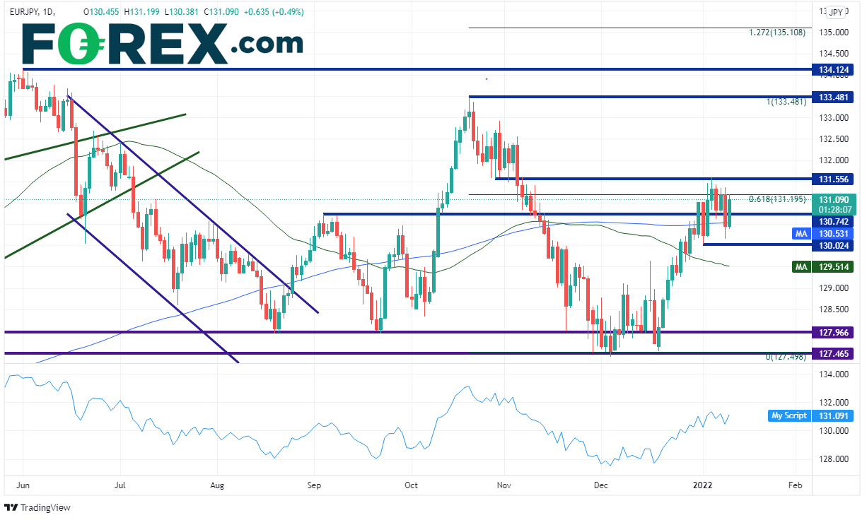 就在德国公债12月初筑底时,欧元/日元也在127.47附近筑底。但12月20日以来,欧元/日元有6个交易日下跌,相比之下德国公债下跌的交易日天数只有2天。欧元/日元从2021年12月20日的127.52上涨至2022年1月5日的131.60,在这13天里斩获超过400点子的涨幅。该货币对止步于由前低点、2021年10月20日高点到12月3日低点行情的61.8%回档位和200天均线组成的阻力带,即130.53-131.55区间。