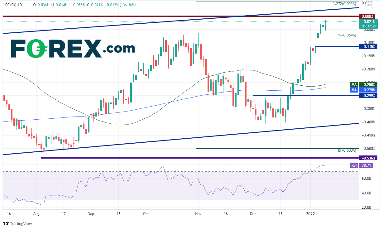 美国10年期国债收益率昨天触及疫情爆发前的2020年1月以来最高点1.808%,但创出新高收益率的并非“独此一家”,还有德国公债收益率,其在今天摸至-0.014%高点,比心理整数阻力大关兼2019年5月以来最高点0.00%仅低了几个跳动点。自从2021年12月8日构筑短线低点-0.395以来,收益率不断走高。 而自2021年12月20日以来,该收益率仅有两个交易日出现下跌行情!