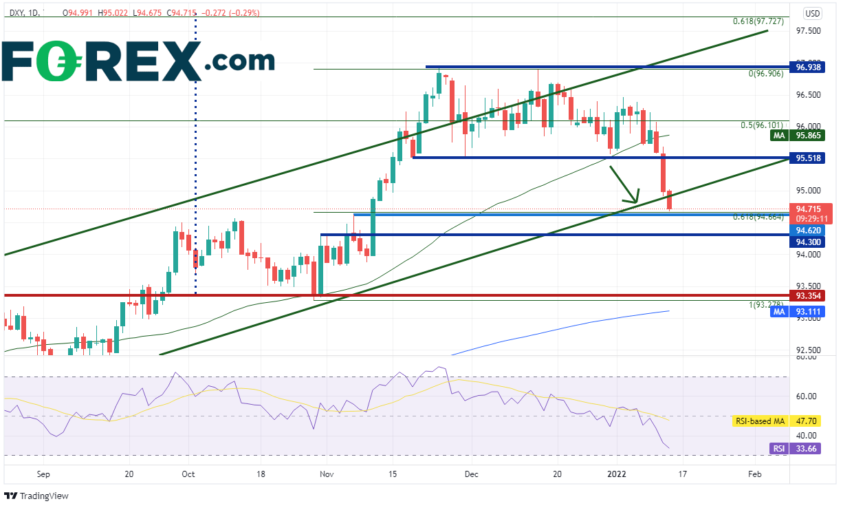美元指数已下破2021年5月以来的(绿色)长期通道的下轨,目前考验2021年10月28日低点到2021年11月24日高点行情的61.8%回档位,即94.66附近。而且,前高点94.62以来的水平支撑位也落在该区域内。如果美元指数失守该支撑,可能下看94.30的小级别水平支撑位。如果该位也失守,价格可能跌至由长期水平支撑位、2021年10月28日低点和200天均线组成的93.11-93.35区间。而若美元指数守住当前价位,第一步可能反击破败通道趋势线所在的94.95附近。
