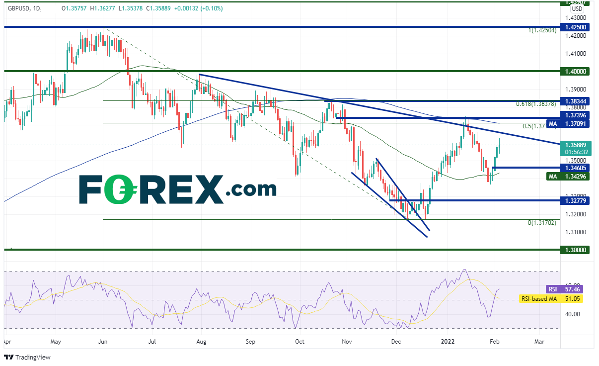 英镑/美元自2021年6月1日在1.4250附近构筑短线顶部以来高点不断下降,于12月8日在一个下降楔形形态内,即1.3170附近筑底。该货币对随后向上打破此形态并在1月13日进入由多个阻力组成的1.3710 - 1.3740区间,包括下降趋势线、200天均线、水平阻力位和2021年6月1日高点到12月8日低点行情的50%回档位。自那以后,英镑/美元一直交投于50天均线和200天均线组成的区间内,两者分别落在1.3430 和 1.3709。