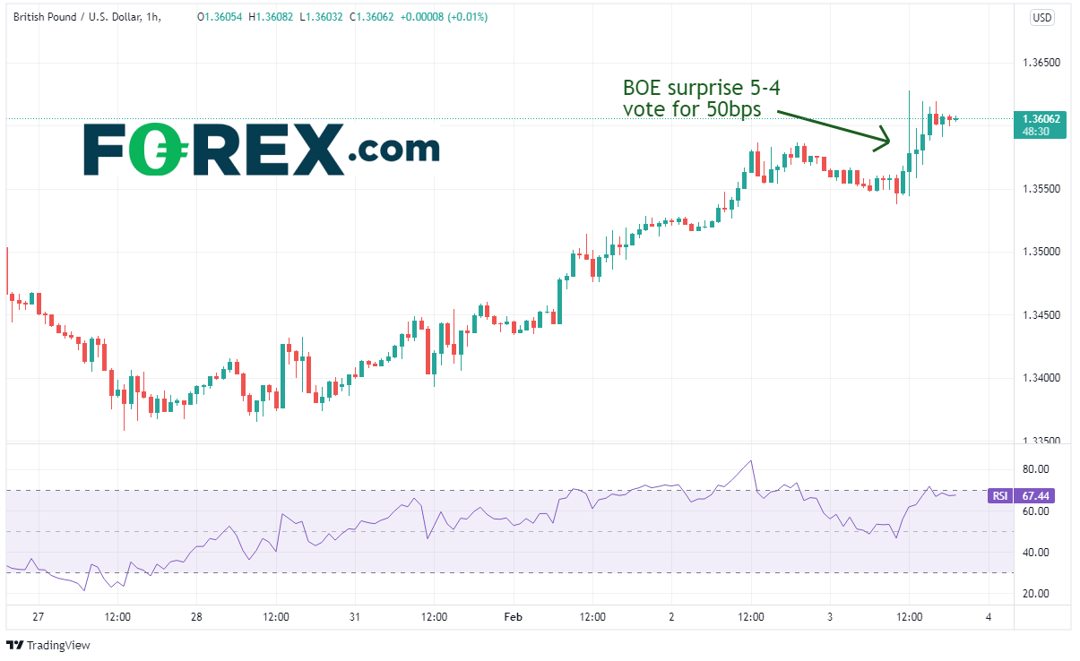 英国央行宣布加息25个基点,这样的决策符合预期。但9名成员中有4名成员投票支持加息50个基点,所以加息幅度差点就达到50个基点。这点出乎市场意料,英镑因此全线飚升。关于这次票数非常接近的投票,央行行长Baily表示,成员们就应该渐进式收紧银根还是现在就大举行动释放信号展开了激辩。
