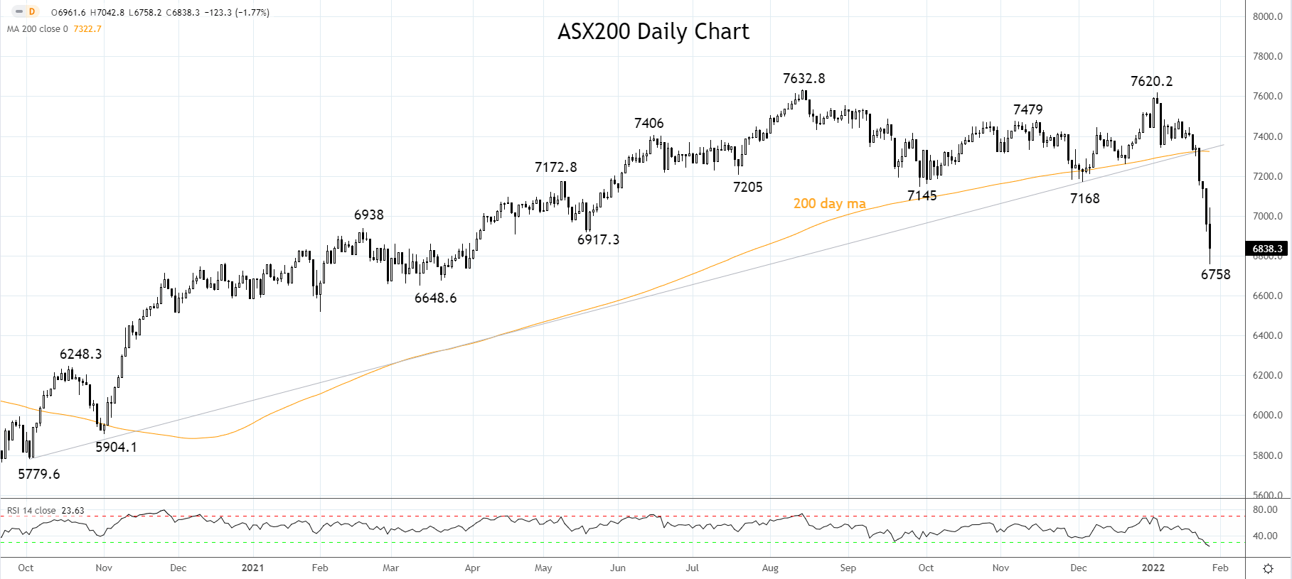 澳大利亚基准指数ASX200较2021年峰值下挫了逾10%。其中大部分跌幅发生在ASX200指数上周下穿关键支撑位7300之后,该支撑位包括200天均线和10月低点5779以来上行支撑位。