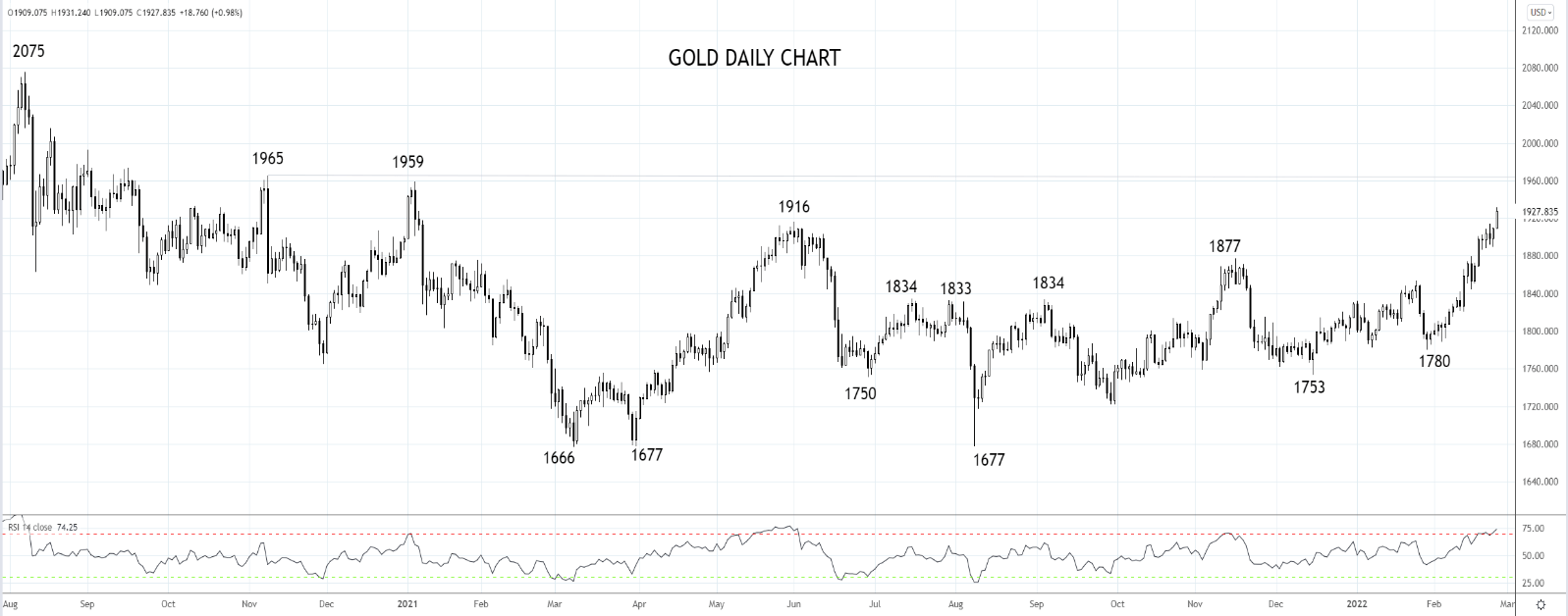 金价已升穿1916美元阻力位,或促使黄金继续上行,攻向下个目标1950/65美元。若拿下,金价有望进一步反弹,再度测试2020年8月2075美元高点。