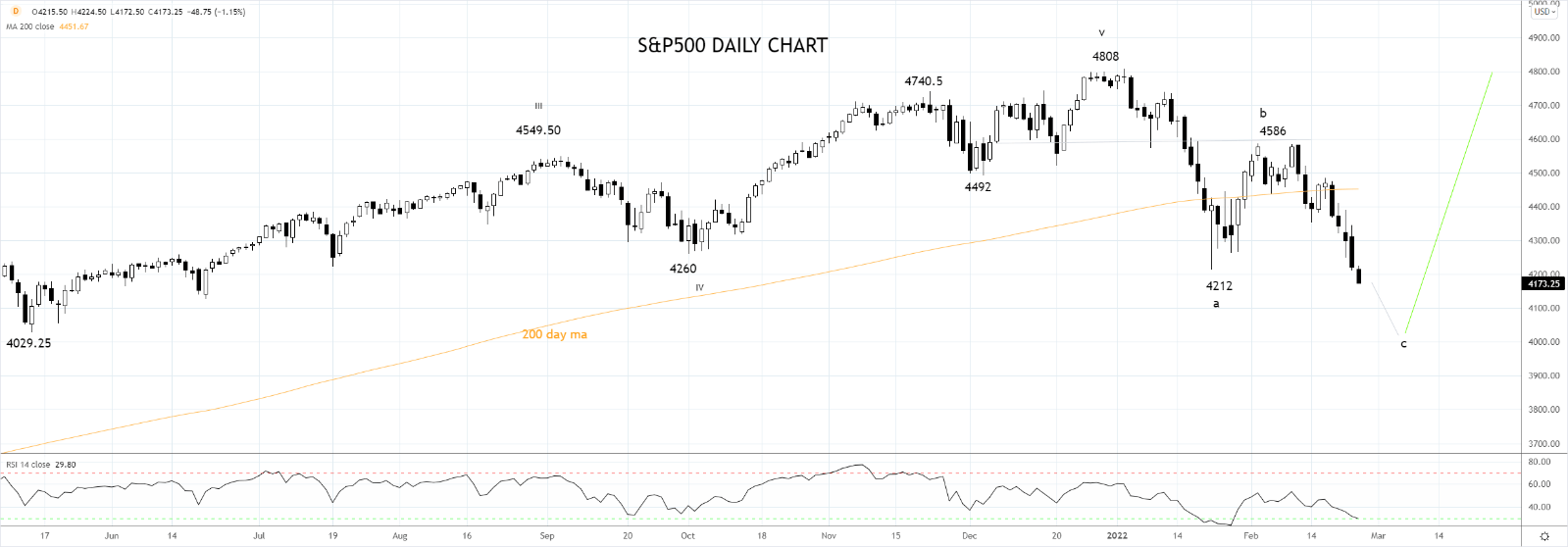 标普500指数上周跌穿200天均线切入位4450后,我们重拾短线看跌。在今天亚盘失守1月下旬4212低点并创下今年以来新低后,股指或继续抛售,进一步推低5%,探向等浪水平4000,从而完成4808高点以来的三浪调整。