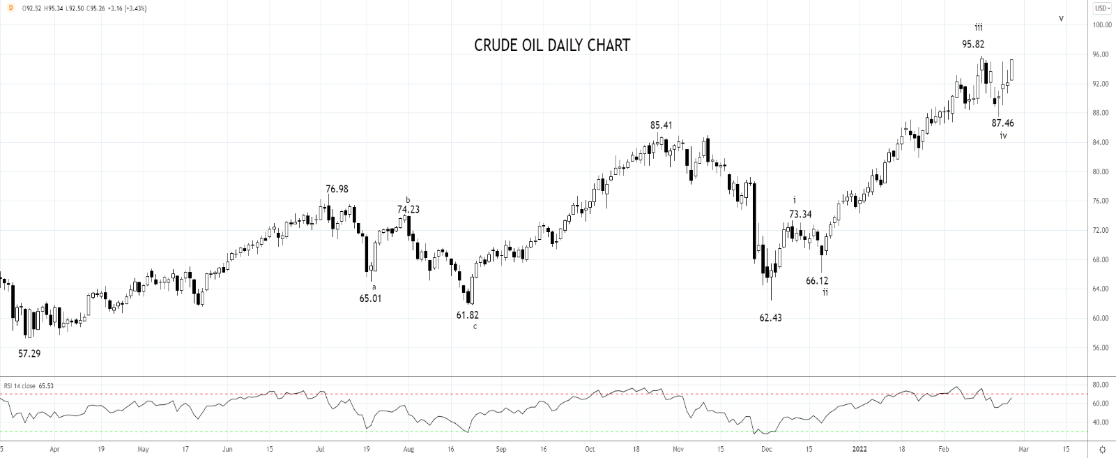 市场紧张情绪、新制裁及俄罗斯于顿巴斯地区军事活动升级,各种因素结合,应该足以带动原油攻破95.82美元/桶高点,然后上穿100美元,并于未来几周上看102.00美元。