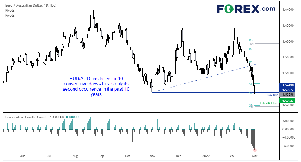 欧元/澳元自其本月高点已下跌逾5%,且连续10个交易日走弱,为10年中第二个连续10天下挫期。均值回归会在某个时点发挥作用,但前提是市场情绪允许。展望后市,2021年2月低点不消一天ATR即可触达,但我们要注意价格是否可以守住2021年11月低点下方。如果守不住而是站于其上,可能率先发出均值回归终于发挥作用的信号。当然,那可能需要乌克兰危机方面出现一两则积极的消息,我们才可以预期欧元/澳元展开可持续的逆势反弹行情。