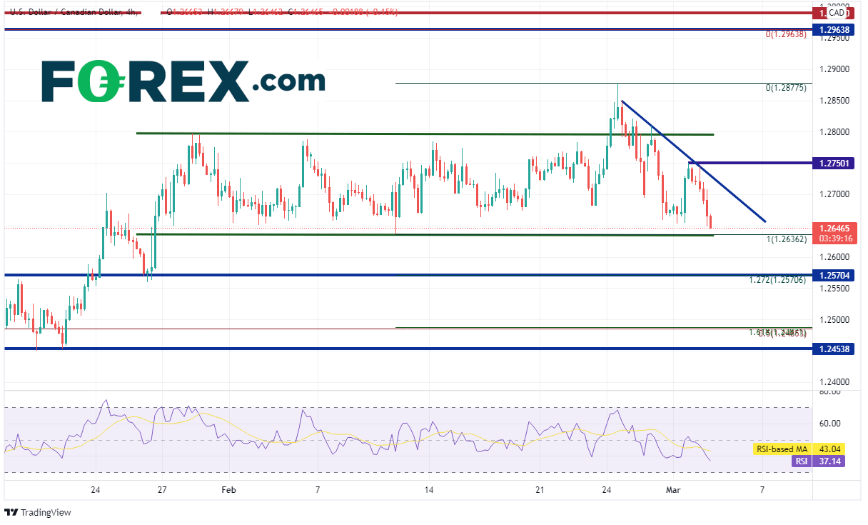 美元/加元4小时图试图站上长达一个月的通道的上轨但以失败告终。请注意,价格突破通道一端失败后往往考验通道的另一端。支撑位在通道下轨,即水平通道线1.2636附近。如果下破,可以下看水平支撑位兼2月10日低点到2月24日高点行情的127.2%扩展位1.2570附近。第三个支撑位在前述行情的161.8%扩展位兼2021年6月1日低点到12月20日高点行情的50%回档位,即1.2485附近。