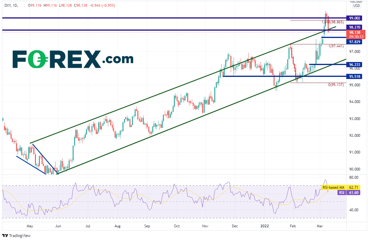 俄罗斯与乌克兰之间的战争出现结束的一线希望,美元因此将自创下2020年5月最高点以来的近期涨幅回吐一部分。美元指数周一测试了2021年5月以来的上斜通道的上轨趋势线、水平阻力位与1月28日高点到2月4日低点行情的161.8%扩展位后触及盘中高点99.42,RSI同样处于超买区域。美元指数今天迄今下跌近1%,回到长期通道内部。
