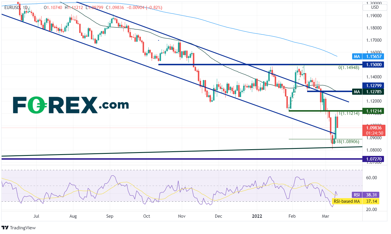 欧元/美元日图在央行会后反弹,自1月28日低点到2月10日高点行情的161.8%扩展位,兼2017年1月以来的长期水平趋势线,即1.0890回升,但突然止步于前低点现阻力1.1121。下档第一支撑在前述长期趋势线及3月7日低点1.0806附近,然后是水平支撑位兼2020年4月以来低点1.0727。阻力在周四高点兼1月28日低点1.1121、2021年5月以来下降趋势线1.1200附近。
