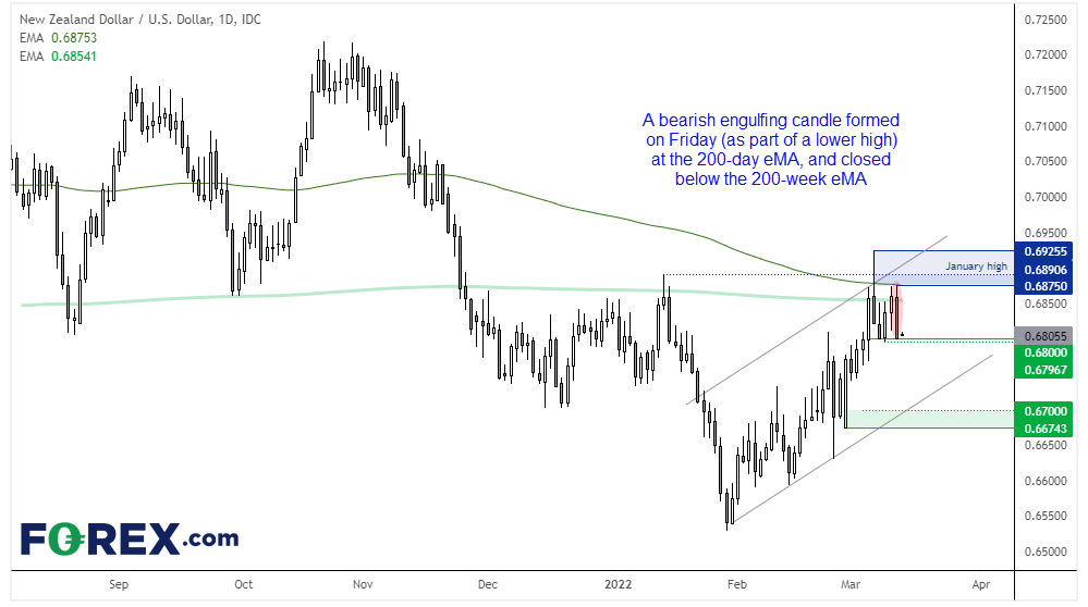 上周一,纽元追随大宗商品价格上涨,摸至15周高点。但油价回落携手美元上涨,令纽元/美元在其200天指数移动均线处调头向下,回到200周指数移动均线下方。日图形成了下降的高点和看跌外包吞噬K线,收于0.6800支撑位。