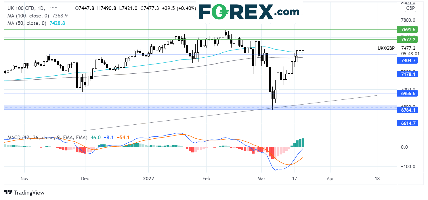 FTSE100指数自3月7日低点6760反弹以来不断开疆拓土,收复了50天和100天简单移动均线且站上7400支撑。