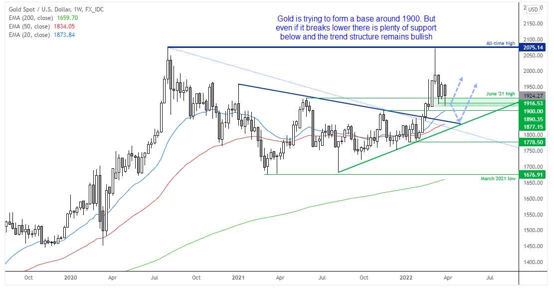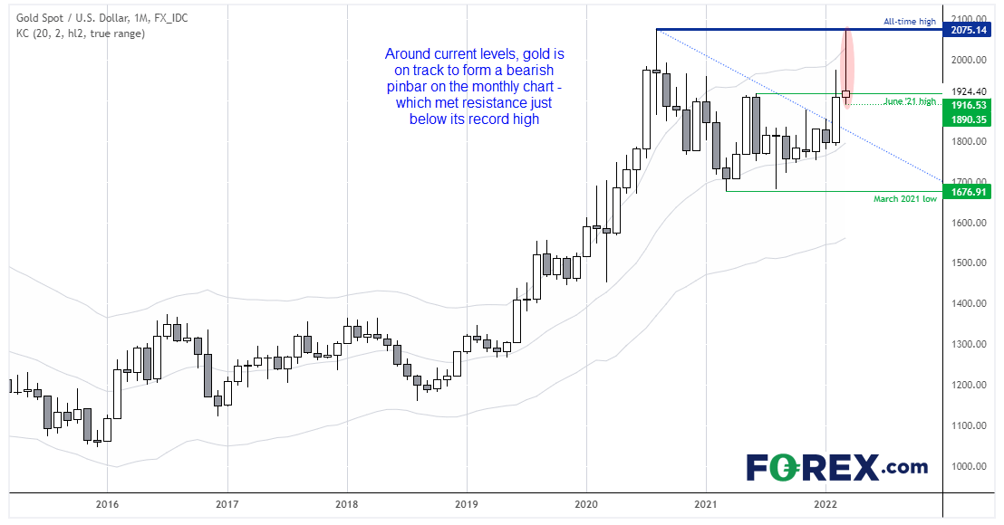 钯金属3月的波动性创下2020年3月以来之最,可以很好地解释过去几周市场的波动性水平。钯金自身下跌压力也不容忽视:自本月高点下跌了40%左右。相比之下铂金的跌幅“只有”20%,但月图和钯金一样,可能走出看跌吞噬K线。铜价在3月7日短暂创下历史高点后暴跌11%,但现在跌幅收窄至区区5.8% - 置于上海封城的背景下,表现不算太差。但高涨的波动性推动资金管理者蜂拥减少对这些市场的投资,营造了波动与震荡交易的完美环境。