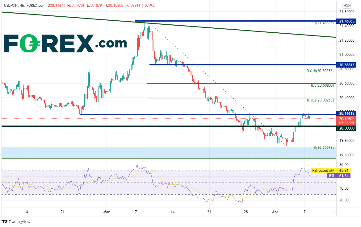美元/墨西哥比索4小时图自该支撑区域回升,今天止步于水平阻力位20.1951附近。如果可以站于其上,或上看3月8日高点到4月4日低点行情的38.2%回档位,即20.3926附近,然后上攻由50天和200天均线构成的20.4173 - 20.4539区间(请看日图)。下档支撑在19.5491 - 19.7275区间,然后直至18.5235的水平支撑位(请看周图)。
