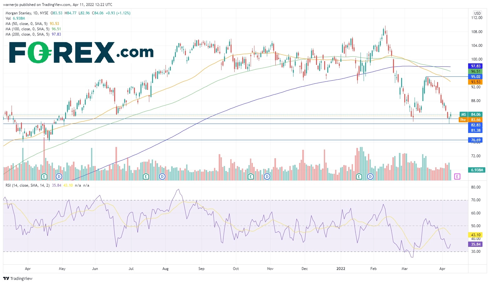 摩根士丹利股价在2022年2月创下109.73的历史新高,但此后大幅下挫,今天交易价格逼近84,跌幅超过22%。
