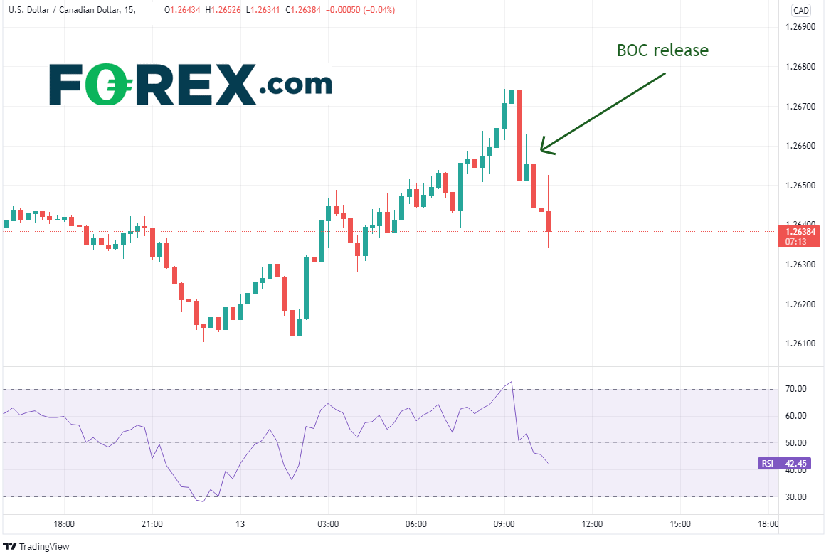 美元/加元受加拿大央行决策的影响先是下跌,交易者预测央行今后继续加息。央行决策发布后15分钟内价格在1.2625-1.2675区间剧烈波动。
