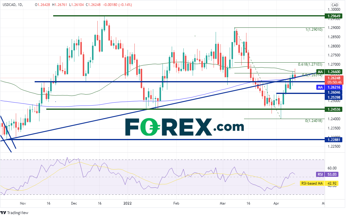 美元/加元今天在加拿大央行决策发布后回落,目前的交投区间为1.2604 - 1.2660,如果向上突破,第一阻力在3月8日高点到4月5日低点行情的61.8%回档位1.2705,如果攻克,可以上涨并测试3月8日以来高点1.2901,然后上看2021年12月20日以来高点1.2665。但若下破1.2604,下看水平支撑位1.2540以及近期区间的下轨支撑1.2454和4月5日锤子形态低点1.2402。