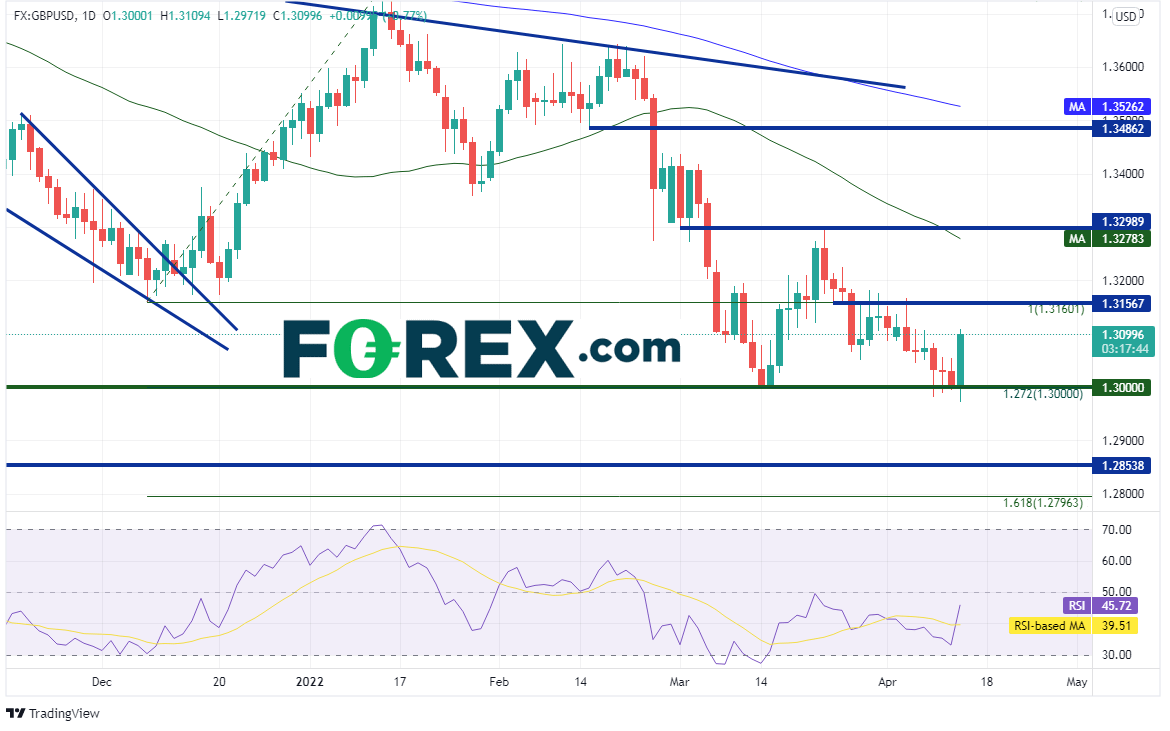 但今天所有美元货币对中走势最引人瞩目的是英镑/美元,其在过去3天一直努力下探,日图跌至2021年12月8日低点到2022年1月13日高点行情的127.2%扩展位兼心理整数支撑关口1.3000,但今天起飞。反弹的主要原因可能是英国3月CPI远高于预期的6.7%,达到7%,也高于2月的6.2%。如果叠加美元走弱,可谓完美风暴。英镑/美元今天在1.2972构筑新低,交投于140点子的区间内,也形成了看涨吞噬K线。水平阻力位在前下破位1.3157附近,如果攻克,上看50天均线1.3278。今天低点下方有一根2020年11月以来的水平支撑位,落在1.2854,如果攻克,可能下探上述行情的161.8%扩展位1.2796。