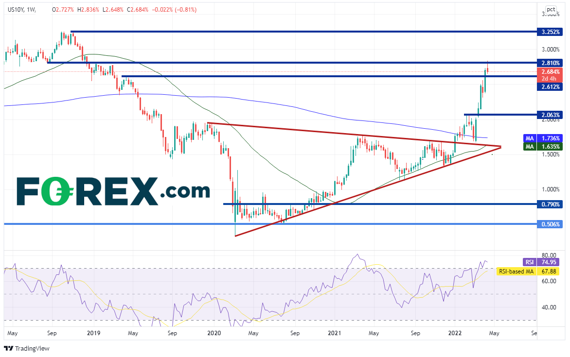 众所周知美国债券收益率最近大涨,但10年期收益率已遭遇阻力。周图上的阻力落在2018年12月以来的水平阻力位2.81%,而RSI也进入超买区域。在一度涨至2.836%高点后,收益率业已回撤。
