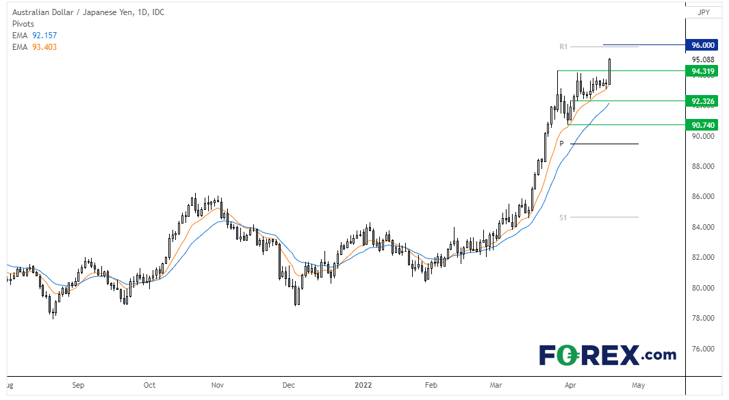 交易者继续忽略日本财政部的口头干预,果断推低日元,导致欧元/日元上涨1.6%,至6年高点;美元/日元上涨1.5%,至20年新高;而澳元/日元是其中的佼佼者,当天上涨了1.8%,强劲收盘,证实经典延续形态。突破上升三角形是经典的看涨结构,但我们在想这一切是否过于完美。因为有时候一些显而易见的形态往往以失败告终。无论如何,澳元/日元正无限逼近96,或吸引多头今天攻占该位。