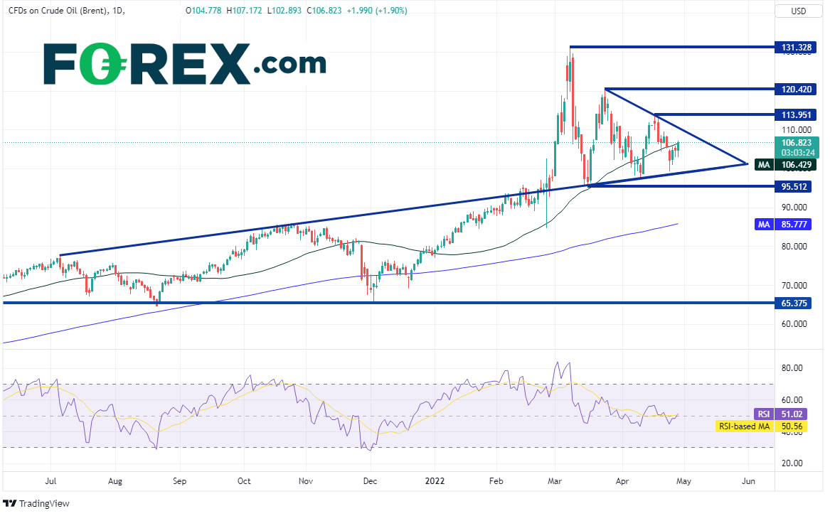 欧盟准备禁运俄罗斯原油,油价因此大涨。如果西得州原油和布伦特原油可以双双击穿各自的三角形,有望打开上行空间。