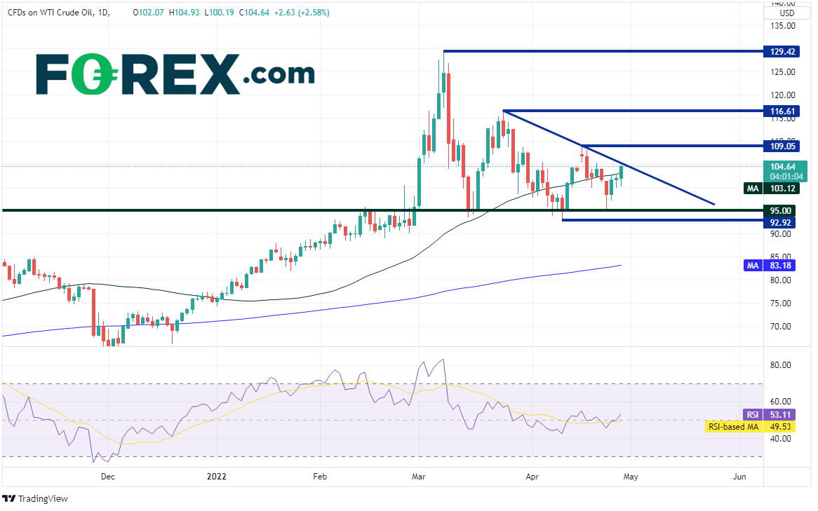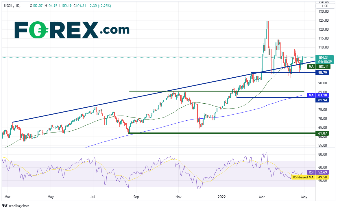 欧盟终于准备不再进口俄罗斯原油了吗?欧盟此前和其它部分国家一起一直不支持禁运,但周四有媒体报道,德国现在准备不再自俄罗斯购买原油。欧盟接下来必须找到新的能源进口来源,这点帮助西得州原油和布伦特原油今天涨逾2.5%。