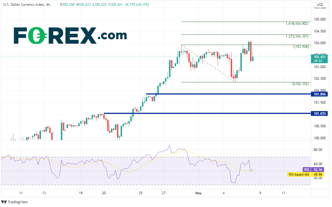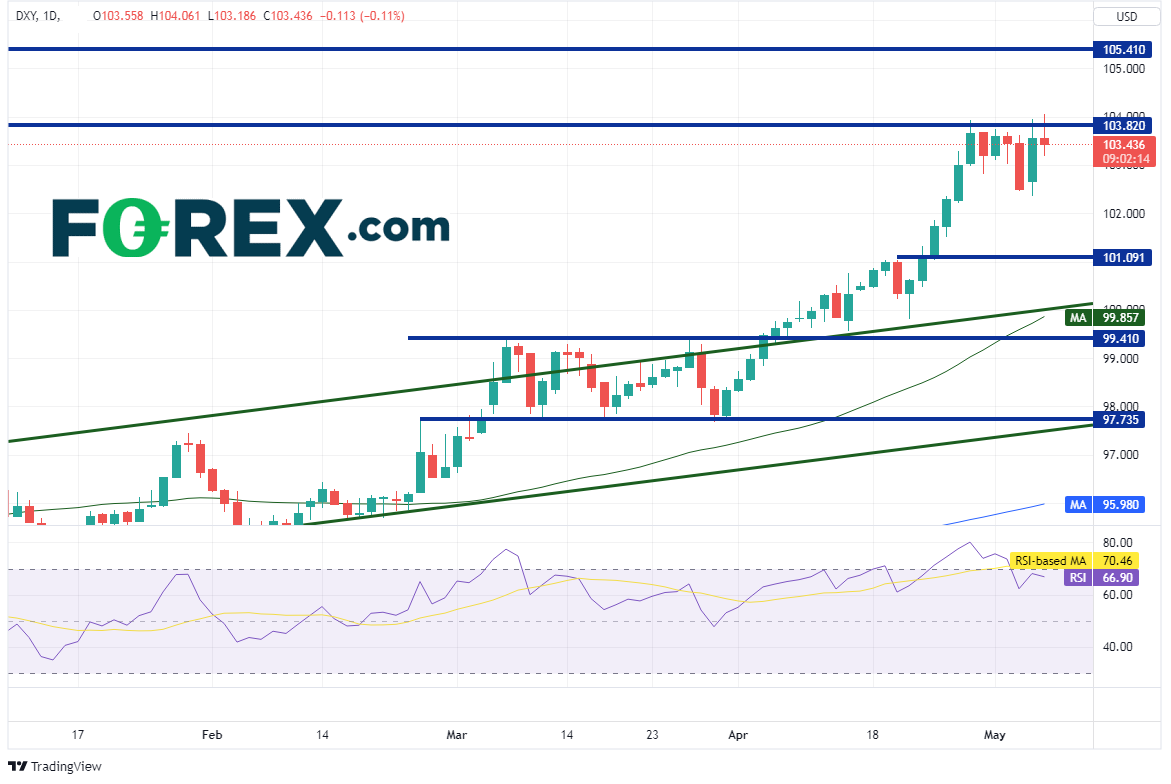 美元指数2021年5月以来有序走高并形成上升通道,于4月初站上通道上轨趋势线所在的99.30附近,然后开始走出抛物线式行情,在4月28日到达20年高点103.93。该指数上周五一度站上103.93,创下2002年12月以来最高点104.06。请注意,RSI处于此前超买区域,得到近期盘整走势的缓解,回到了中性水平。