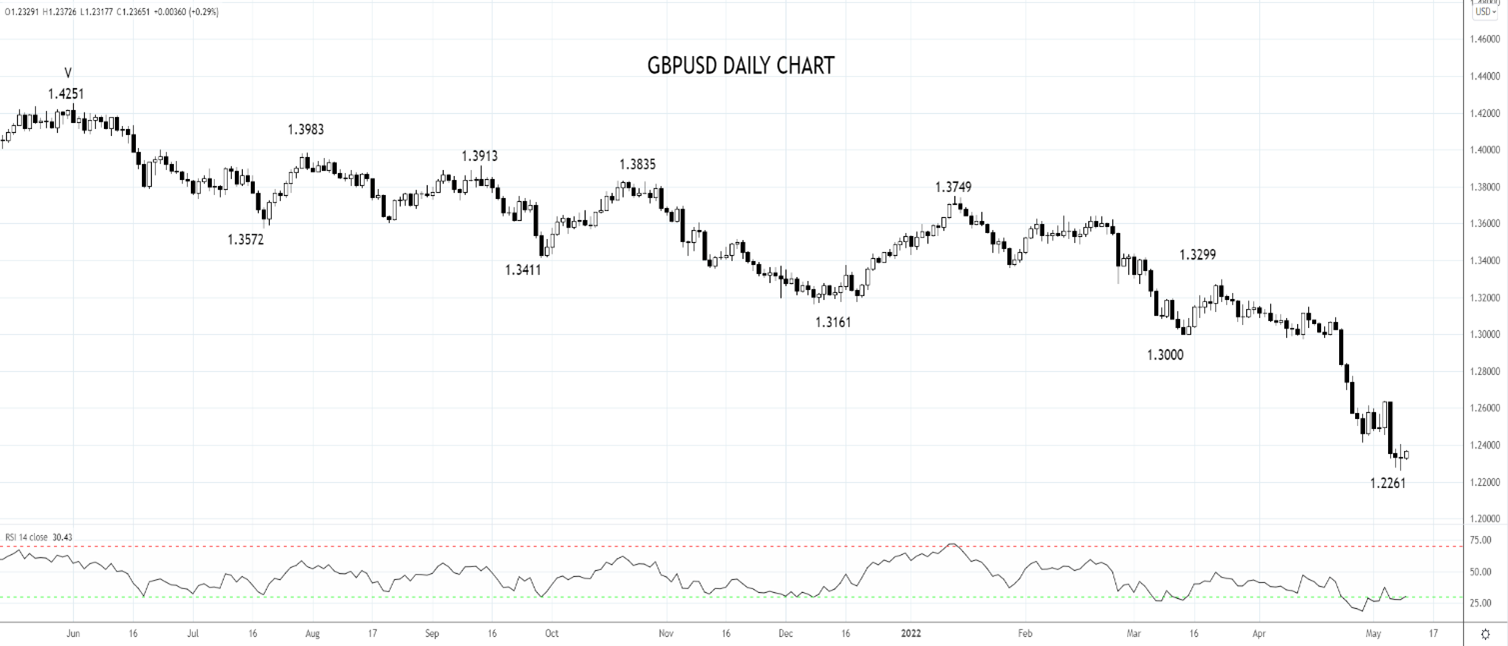 再来看英镑/美元。该货币对的技术面结构与美元/日元相似,既在昨晚低点1.2261处形成动能丧失的K线形态,又有RSI指标的看涨背离信号。一旦股市暴跌势头在交易产品中蔓延,即使宏观背景看跌,英镑/美元还是有可能反攻上周高点1.2640。