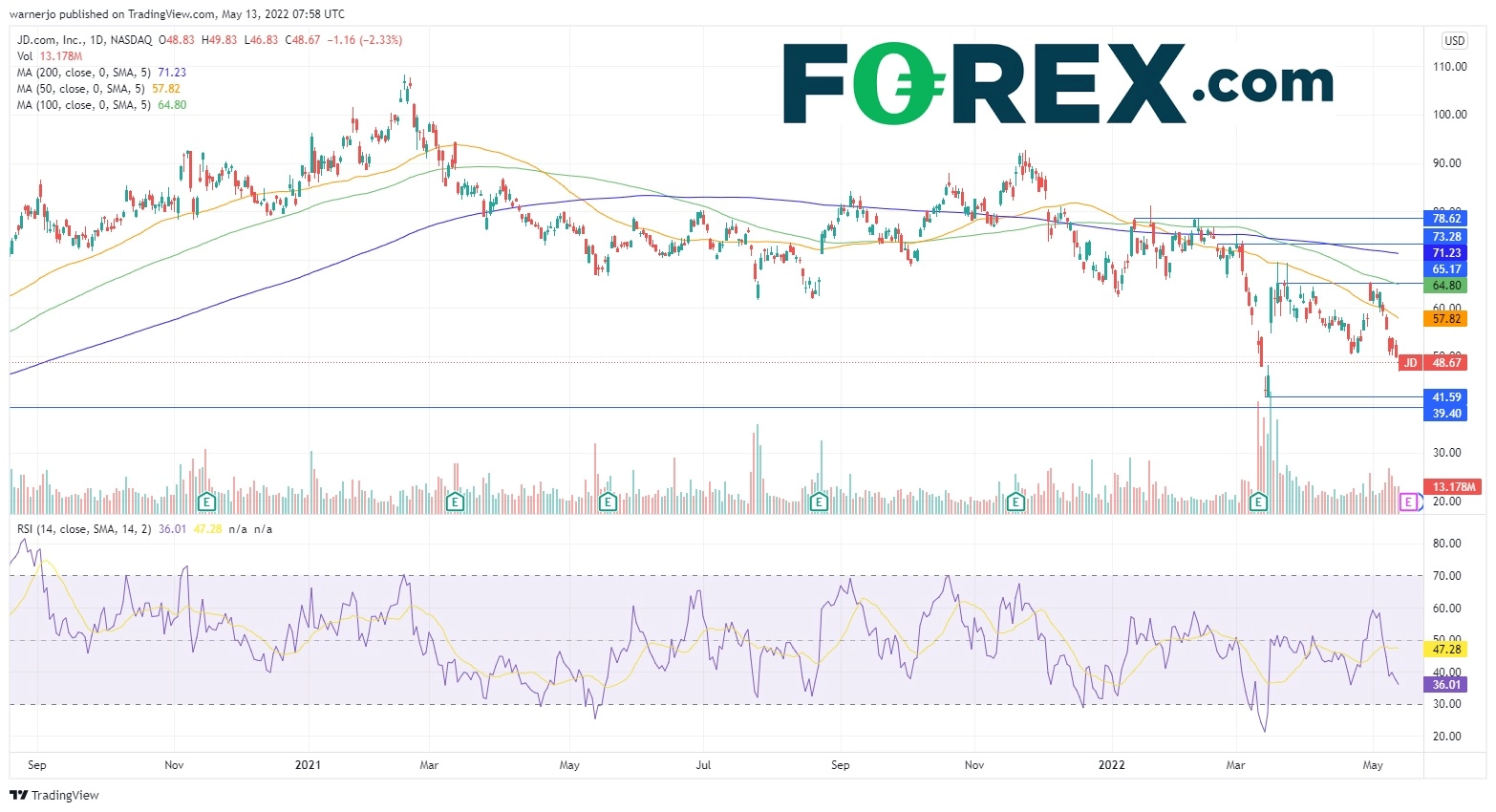京东股价在2022年呈现剧烈波动行情,交投区间在82美元高点-41.5美元两年低点。