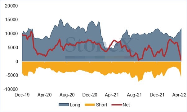 完全主动型基金截至周二(5月9日)持有的白银空头合约为38106吨,为去年12月中旬以来最高点;持有的白银多头合约处于2020年5月以来最低点,净多头合约为1846吨,是去年9月以来最低点。上周二现货白银在下探21。