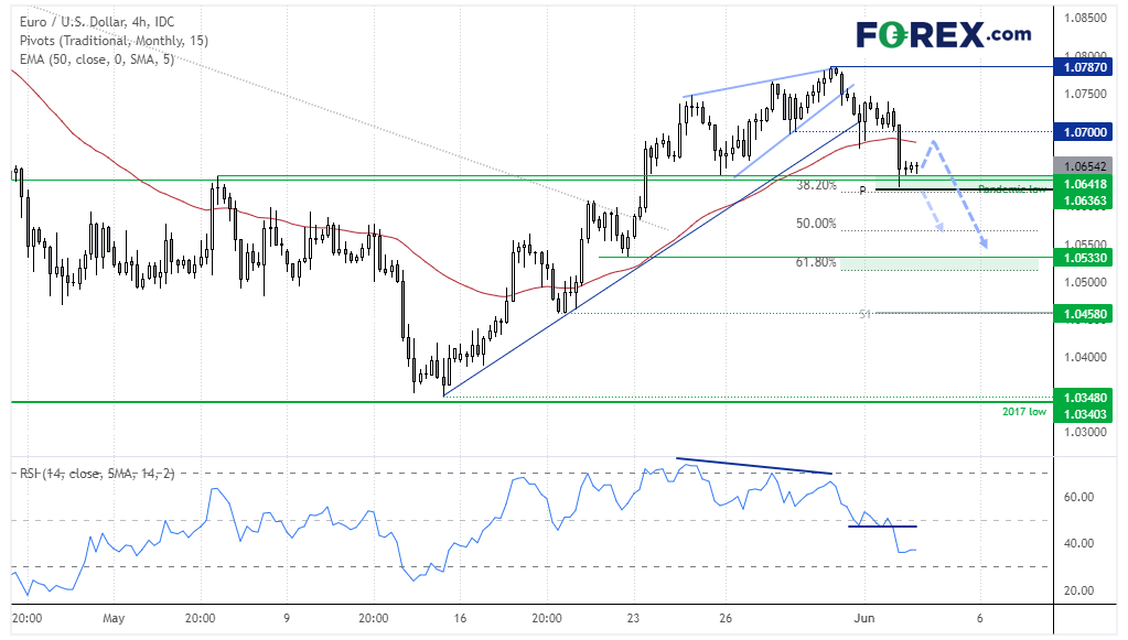 但1.0635/50附近是一个包括38.2%斐波那契回档、月图枢纽和波段高点在内的强劲支撑区域。我们猜测在构筑高点降低并下破关键支撑区,探向1.0530支撑前,汇价可能会自当前水平反弹。反之,若直接失守1.0630,则暗示看跌继续。