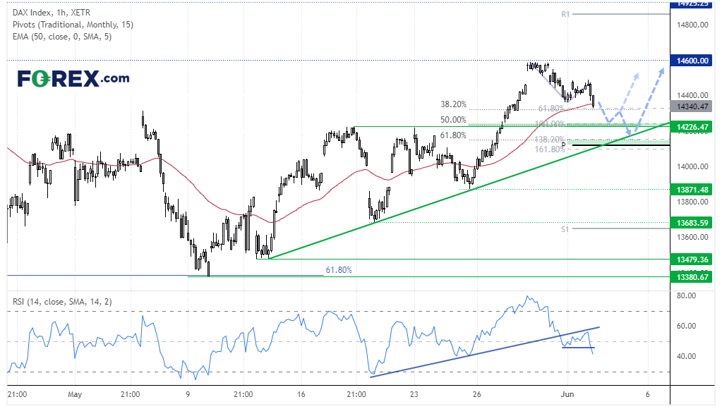 空头可能锁定(或多头寻求做多机会)的潜在支撑落在在14315、14225和14150附近,这里是斐波拉契水平集群位置(及趋势支撑和下方支撑月线图枢纽点)。