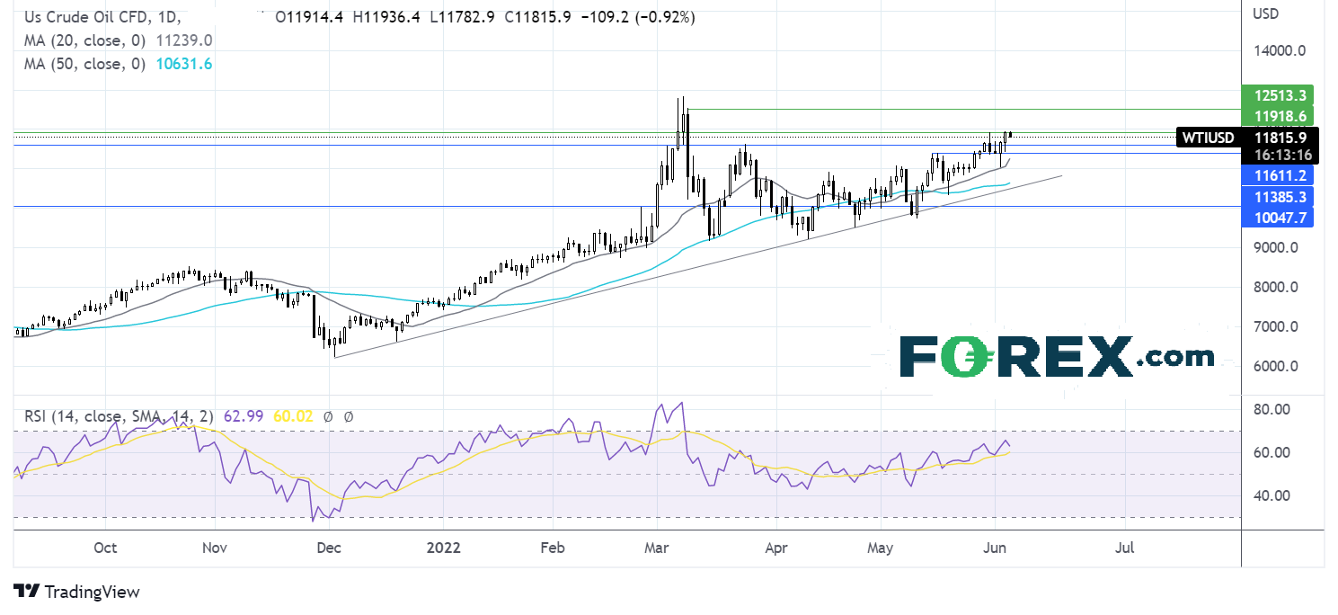 油价交投于其上升趋势线支撑和20及50期均线上方,在120遇阻后略有回落。RSI支持扩大上行。