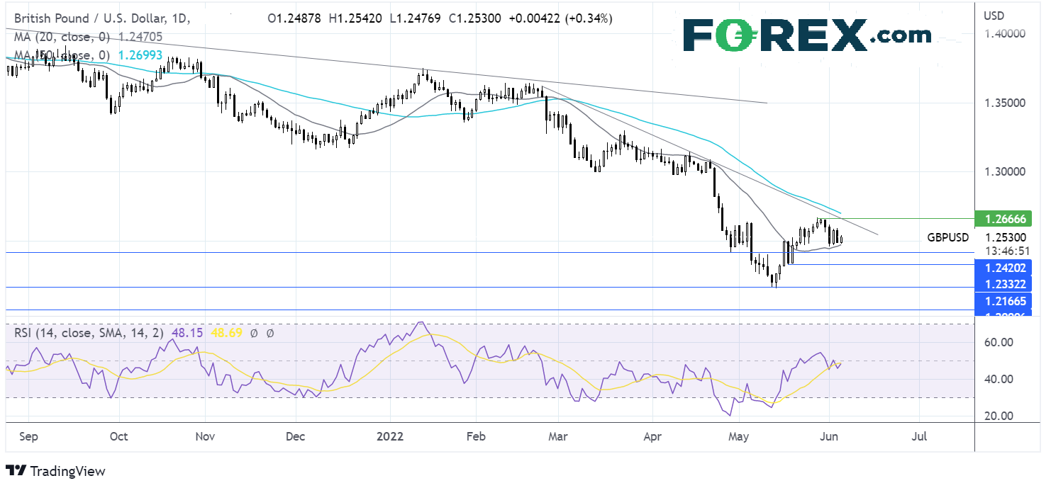 如果突破,空头的目标是下破20期均线1.2470,并进一步下看4月低点1.2410和5月19日低点1.2330。