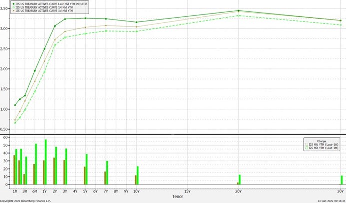 美国债券收益率曲线,当前与1周和1个月的走势