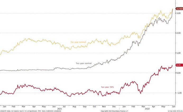 众所周知,通胀以及伴生的央行政策是市场当下的主要话题,但上周五公布的美国CPI数据激起了全面又强烈的反响,使得本周的FOMC会议格外引人瞩目。薪资增长没有跟上通胀是另一个隐忧,而美国2年期和10年期债券收益率曲线接近于倒挂,反映了市场的避险情绪,尤其是衰退忧虑引发的避险情绪。本周晚些时候我们将就央行政策方面的话题展开更多的讨论,重点关注新兴市场央行与黄金市场。
