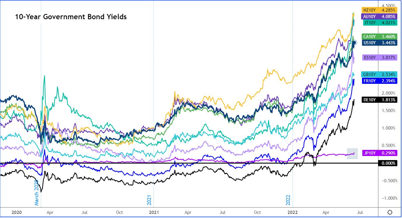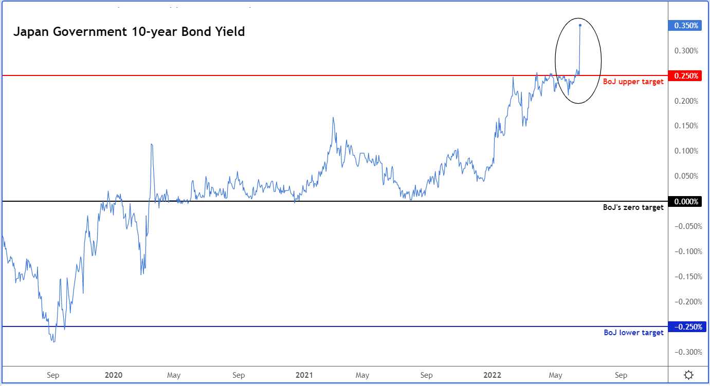 本周属于各国央行,从美联储、瑞士央行到英国央行再到欧洲央行,纷纷采取行动。美联储加息75个基点、瑞士央行出人意料地选择加息50个基点、英国央行连续第5次平稳加息25个基点(当前基准利率为1.25%),而欧洲央行召开紧急会议,解决欧盟内部债券市场割裂的问题,安抚情况较差的非核心经济体债券市场的不安情绪。周五到了,现在轮到日本央行登上舞台,日元因此备受瞩目。