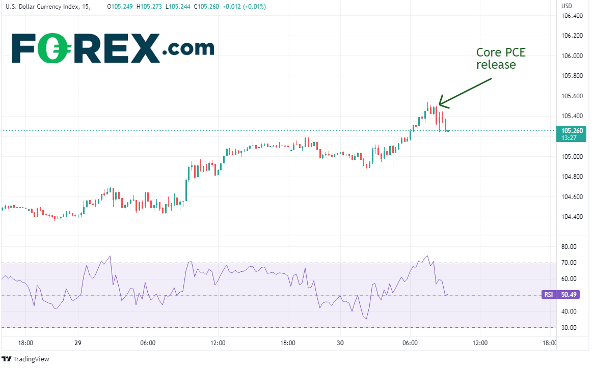 美元指数闻讯回撤。在上述数据发布之后的第一个15分钟内,美元指数从105.50下跌至105.30。