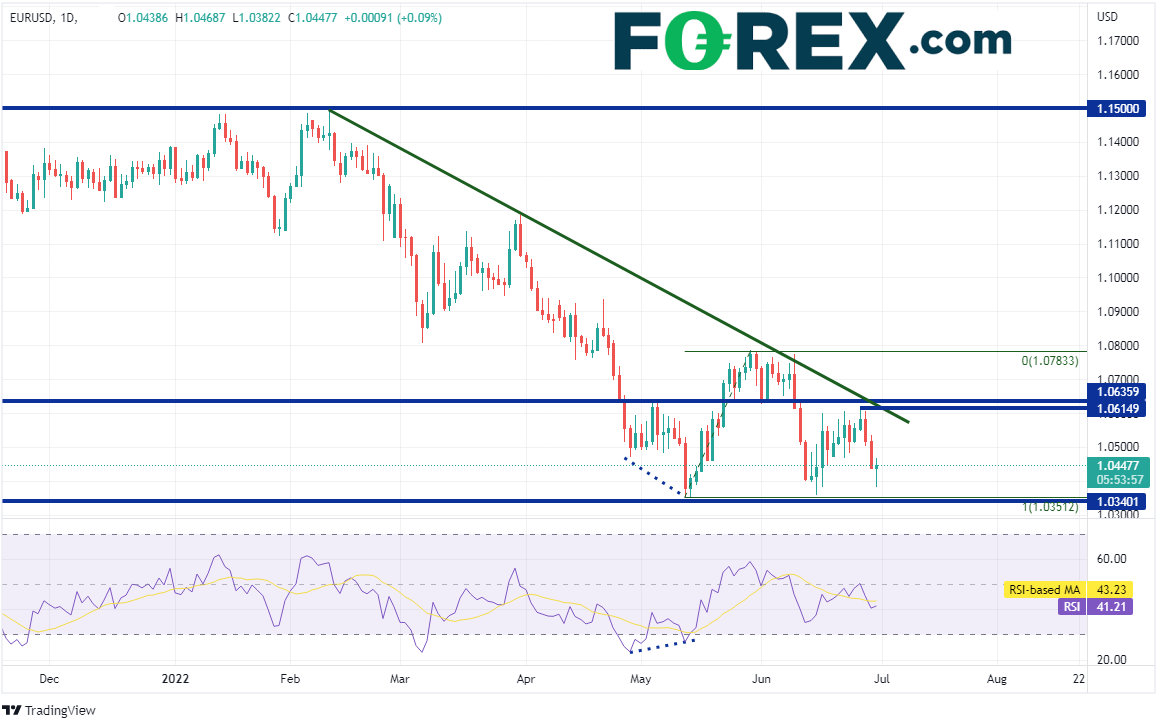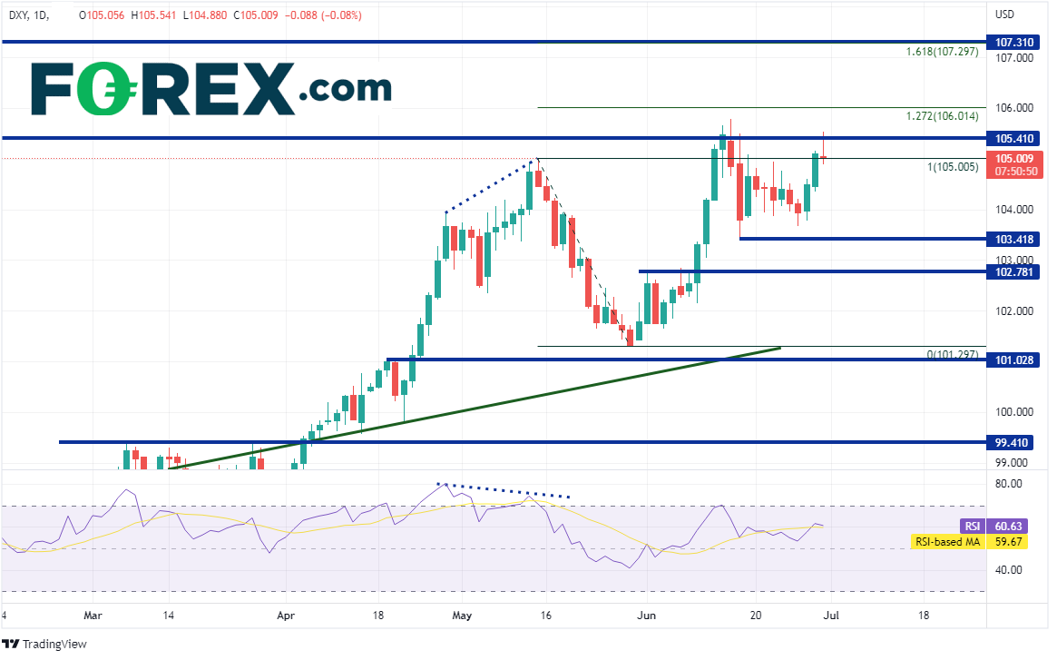 但美元指数在过去的两天半里一直致力于上涨并测试6月15日以来高点105.79,那也是2002年12月以来最高点。此文发稿时当天高点为105.54,上方阻力有5月13日高点到5月30日低点行情的127.2%扩展位,即106.01附近,以及由前述行情的161.8%扩展位和2002年12月以来高点组成的阻力带107.30一线。下档支撑位在6月16日低点103.42、水平支撑位102.78。