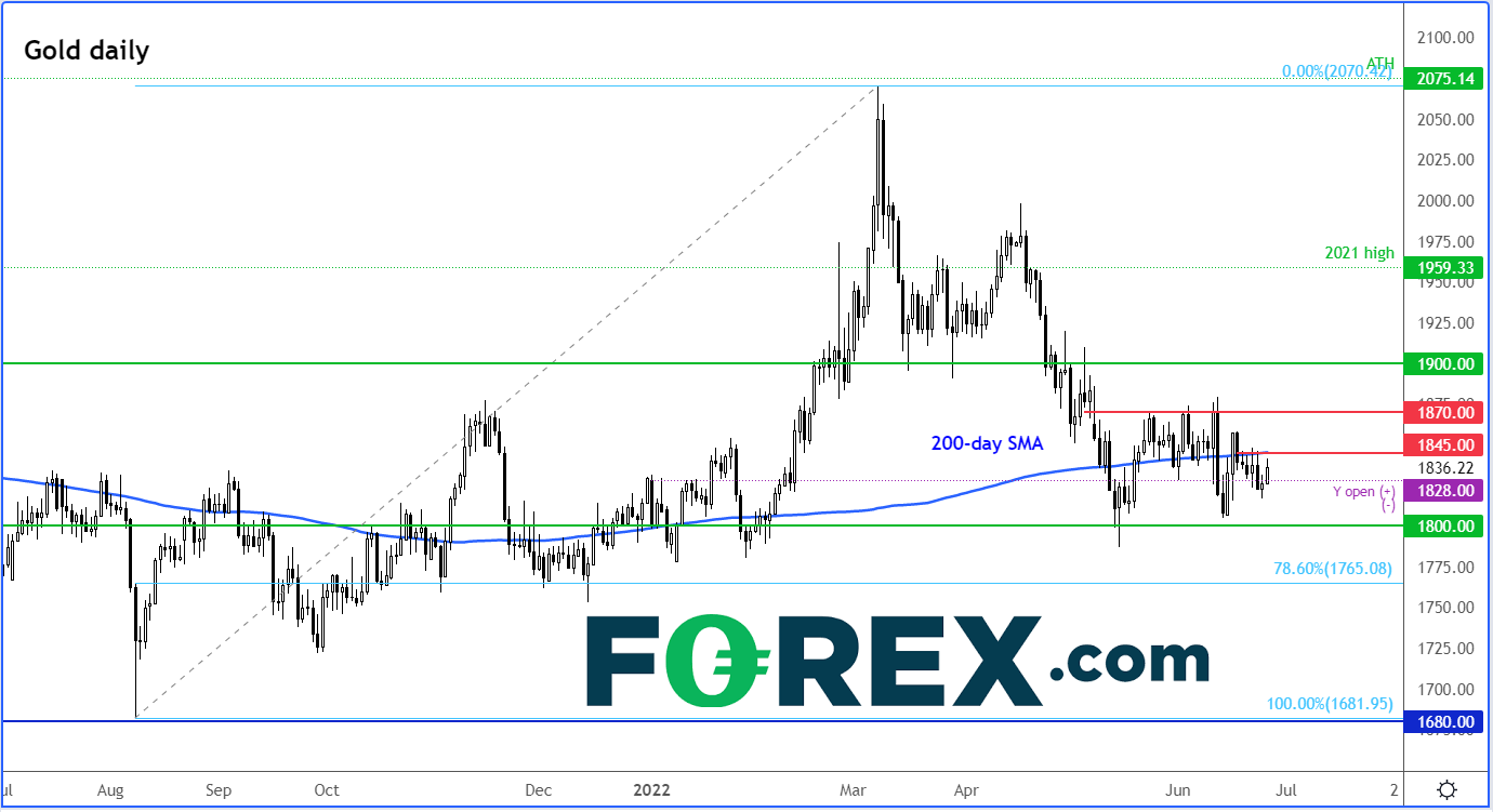 事实上,如果把黄金图表切换到略短点的时间周期,我们就会发现,金价过去几周一直在反复,始终没有明确的方向。在央行加息、通胀关切和衰退忧虑以及最终降息的预期掣肘之下,始终没能摆脱1800-1875一线。这些消息很明显互相矛盾,使得金价难以坚定地走出方向性行情。债券收益率上升与美元普涨从来都不是无孳息/红利资产的利好因素,而金价没有崩溃则意味着其同样获得利多支撑,包括避险买需和通胀对冲资金流。股市等金融市场过去几个月的动荡,催生避险需求。