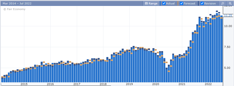 职位空缺情况看来依然处于相当健康的水平,报在1125万,高于预期的1105万,前值修正为1168万。