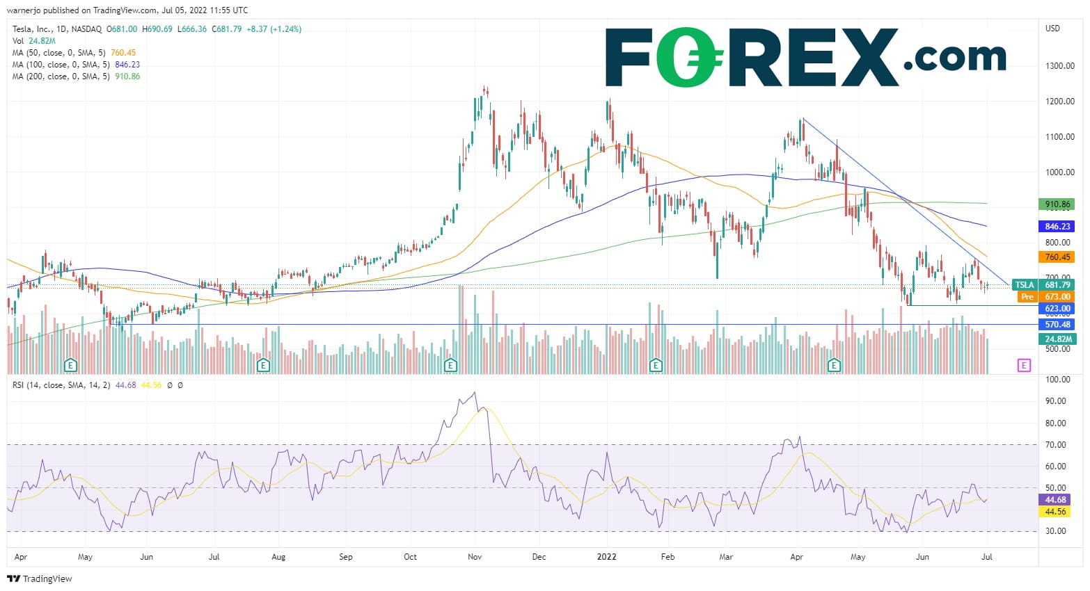 特斯拉股价自4月进入下跌趋势以来暴跌了40%以上,二季度整体上遭遇了有史以来最大的季度下跌。尽管有迹象表明股价在5月底得益于多头在超卖后重新入市而于623美元筑底,但当前下跌趋势依然牢不可破。