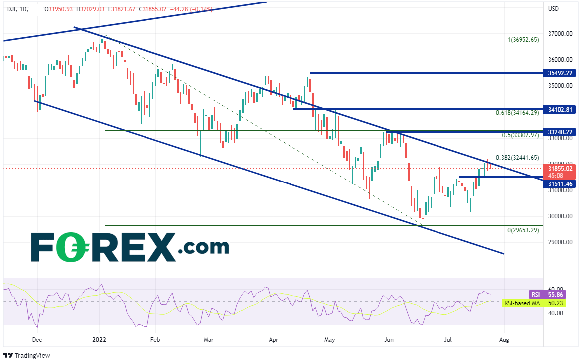 根据Investopedia的定义,道指是价格加权平均指数,追踪30只在NYSE和NASDAQ公开交易的大型股票的走势。该大盘股指的未来方向可能更多地依赖本周将要发布财报的诸多成份股,而不是周三的FOMC决议。3M、 Apple、Boeing、 Caterpillar、 Chevron、 Coca-Cola、 Honeywell、 Intel、 Merck、 McDonalds、Microsoft、 Proctor、Gamble及Visa本周都将公布财报。这些公司的指导意见,包括其是否认为通胀压力挥之不去以及未来经济是否衰退,会影响很多公司。所以,如果这些公司下调盈利预期,其它公司可能跟风下调。那么,道指的后市走势如何?